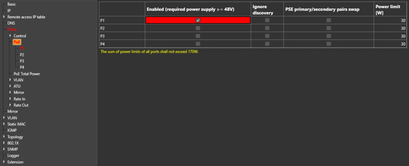Funkcja PoE jest fabrycznie ustawiona jako "wyłączona". Dlatego poszczególne porty, do których podłączone są kamery lub urządzenia obsługujące PoE, muszą być włączone w konfiguracji. Jeśli PoE nie uruchamia się nawet po aktywacji, przełącznik umożliwia włączenie funkcji Ignore Detect.