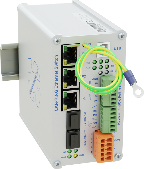 Przełącznik przemysłowy do topologii kołowej z 2x slotem SFP, 3x portem FE PoE, 2x DI z obsługą zbalansowanej pętli, 1x programowalnym wyjściem NO/NC RELAY, 2x magistralą RS485/1x RS422 BUS (obsługa modułów MIOS, serwer TCP, tryb UDP), portem USB do lokalnego zarządzania, redundantnym wejściem zasilania, precyzyjnymi zabezpieczeniami przeciwprzepięciowymi, zarządzaniem zdarzeniami: SMTP, zdarzenia TCP, zdarzenia ETH, klient HTTP (sterowanie kamerą), 8x IPWatchdog.... , temperatura pracy -40...+70°C, VLAN, QoS, IGMP, SNMPv2/v3, SNTP, montaż na płaskiej powierzchni lub DIN35, 12VDC/24VDC/48VDC/12VAC/24VAC/56VDC