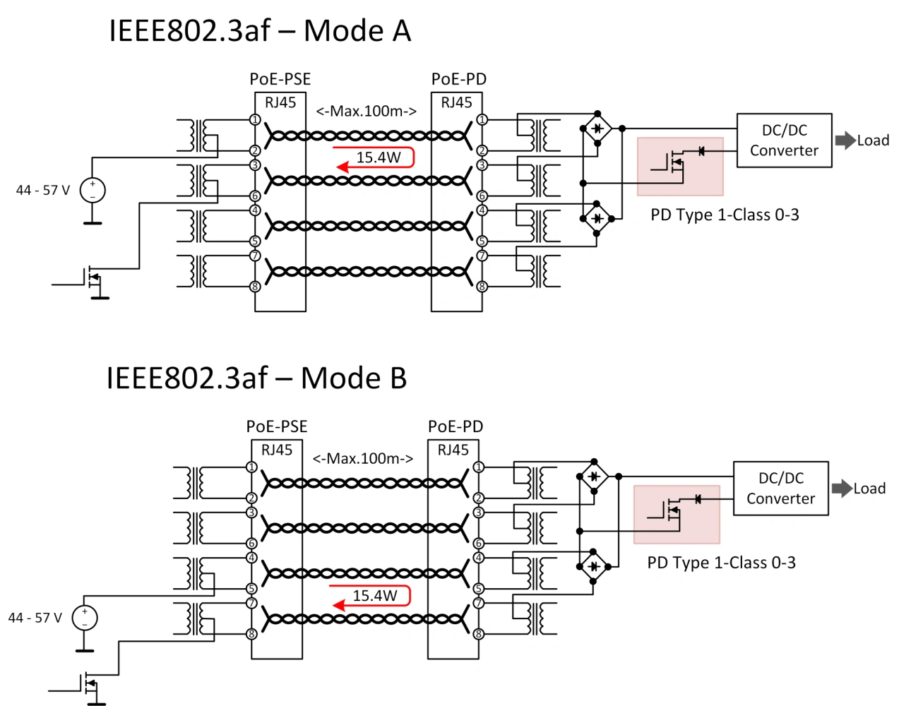 For this reason, the IEEE has issued a new standard, IEEE 802.3at 2009, with a power rating of up to 30 W per port. Each PoE-PD (Powered Device) should again support both modes A and B according to the standard.