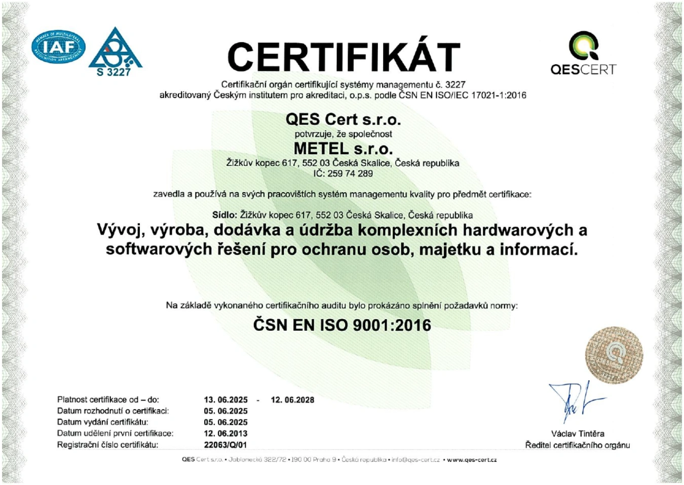 METEL se každoročně podrobuje auditům ISO 9001, které potvrzují náš závazek k řízení kvality. Proto neustále zlepšujeme naše interní procesy, abychom zajistili nejvyšší kvalitu našich výrobků a služeb.