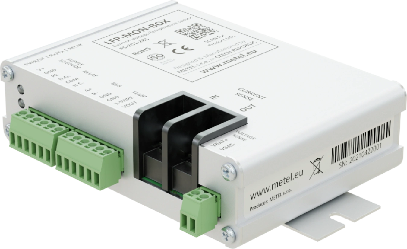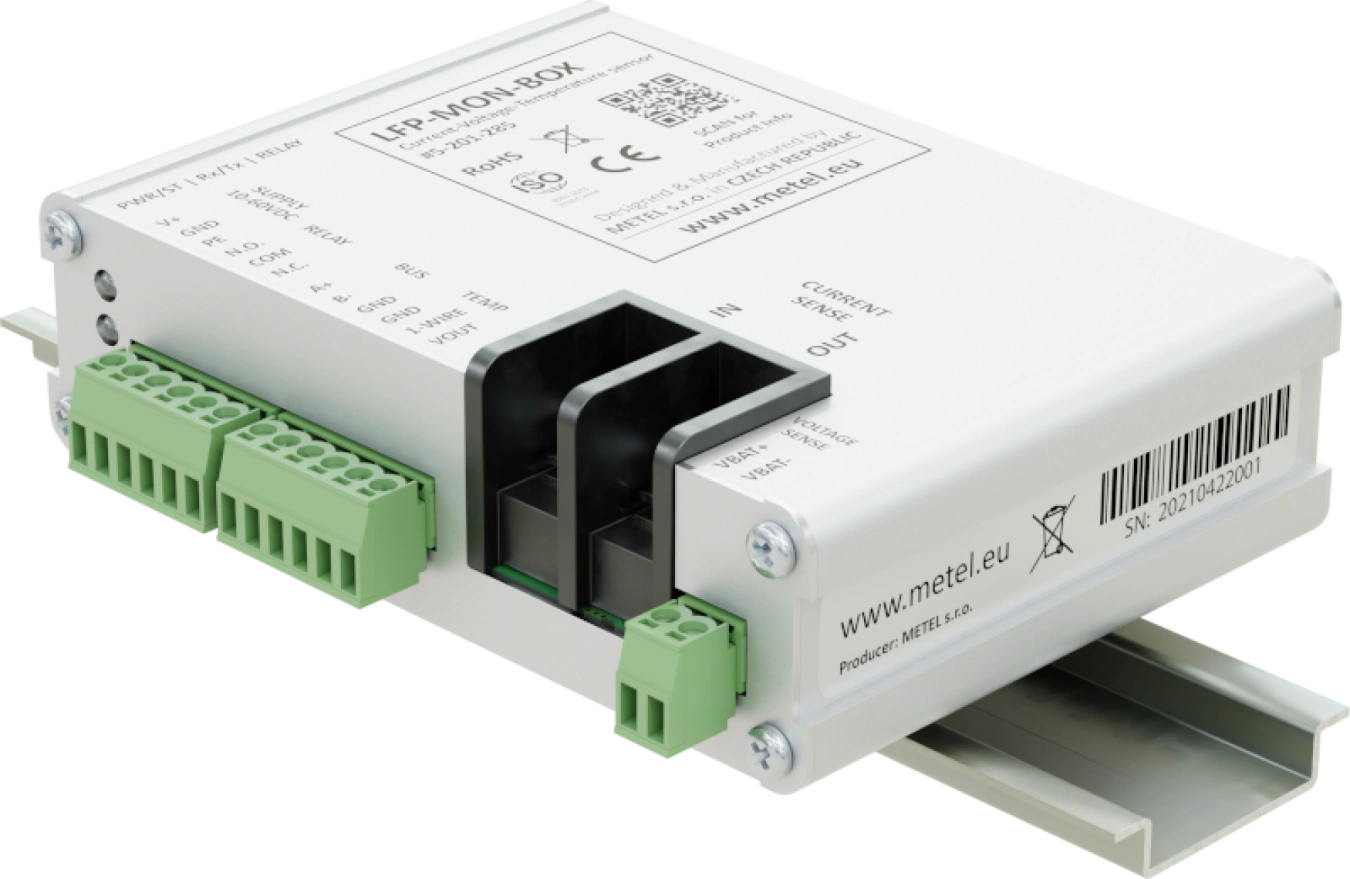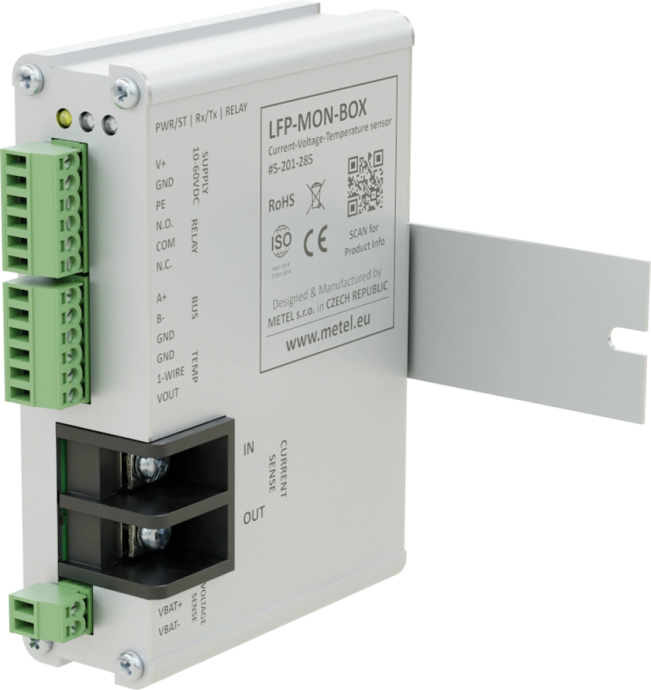 Unità Modbus-RTU per il monitoraggio di temperatura, tensione e corrente della batteria. L'intervallo di corrente misurato di 30 A consente l'utilizzo in un'ampia gamma di applicazioni che richiedono il monitoraggio online della batteria. È incluso un sensore di temperatura digitale esterno a 1 filo per ottenere informazioni precise sulla temperatura attuale.
