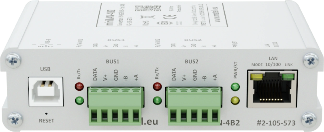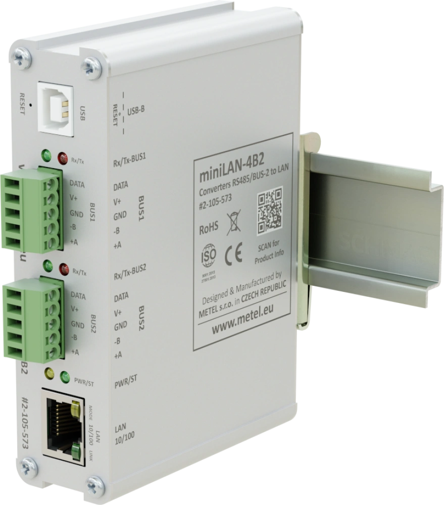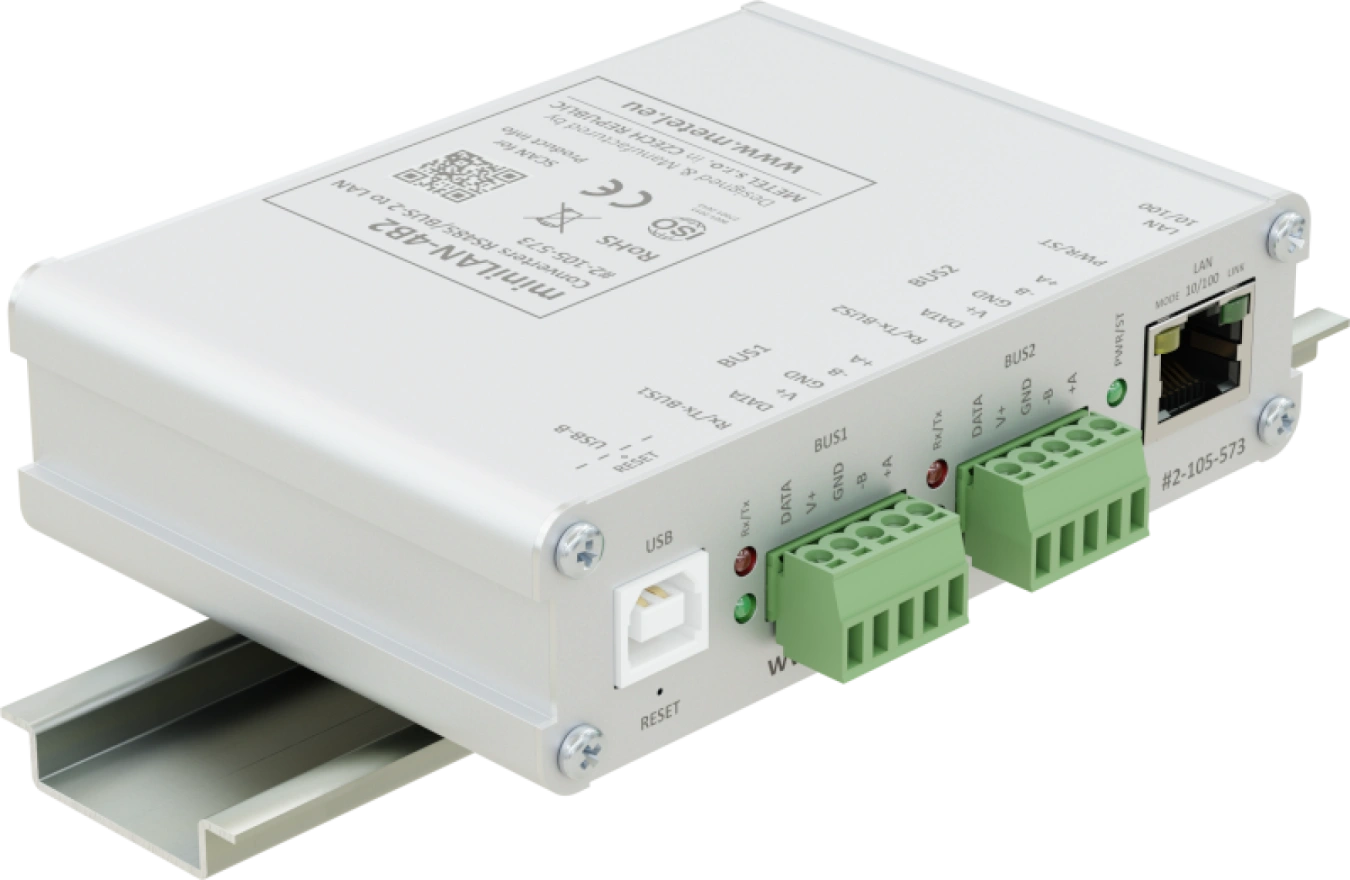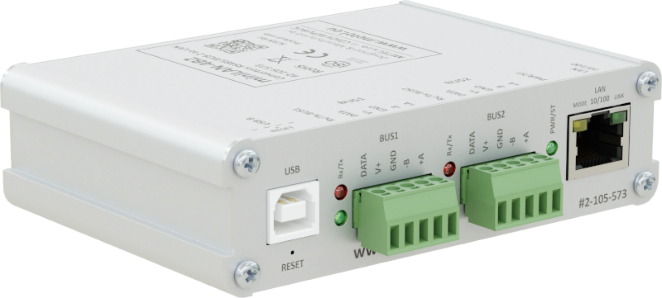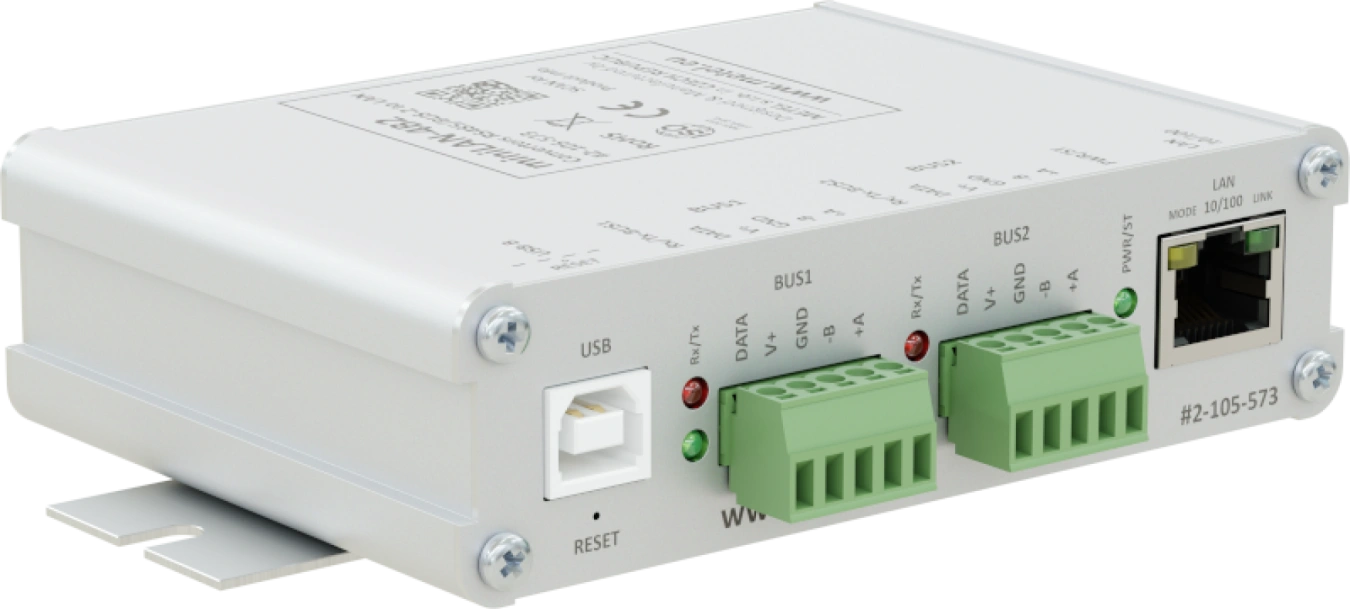 Dwukanałowe konwertery RS485/BUS-2 na LAN. 1x port Ethernet, 2x magistrala RS485/BUS-2, Modbus RTU/TCP, TCP-serwer/TCP-klient, szybkość konwersji portu LAN/RS od 3 ms, ochrona przeciwprzepięciowa 600W dla wszystkich portów, szyfrowane zarządzanie SNMPv3, temperatura pracy od -40°C do +70°C.