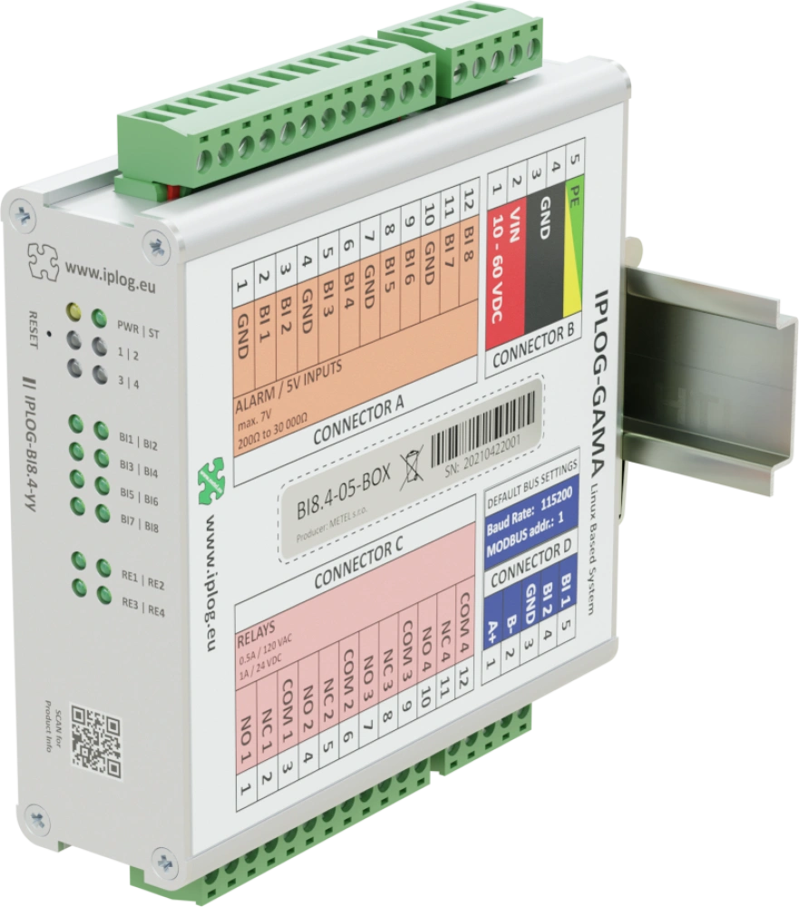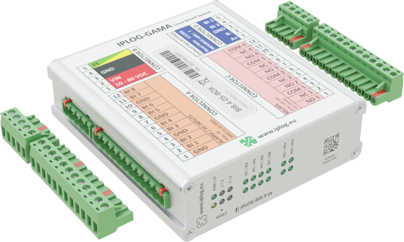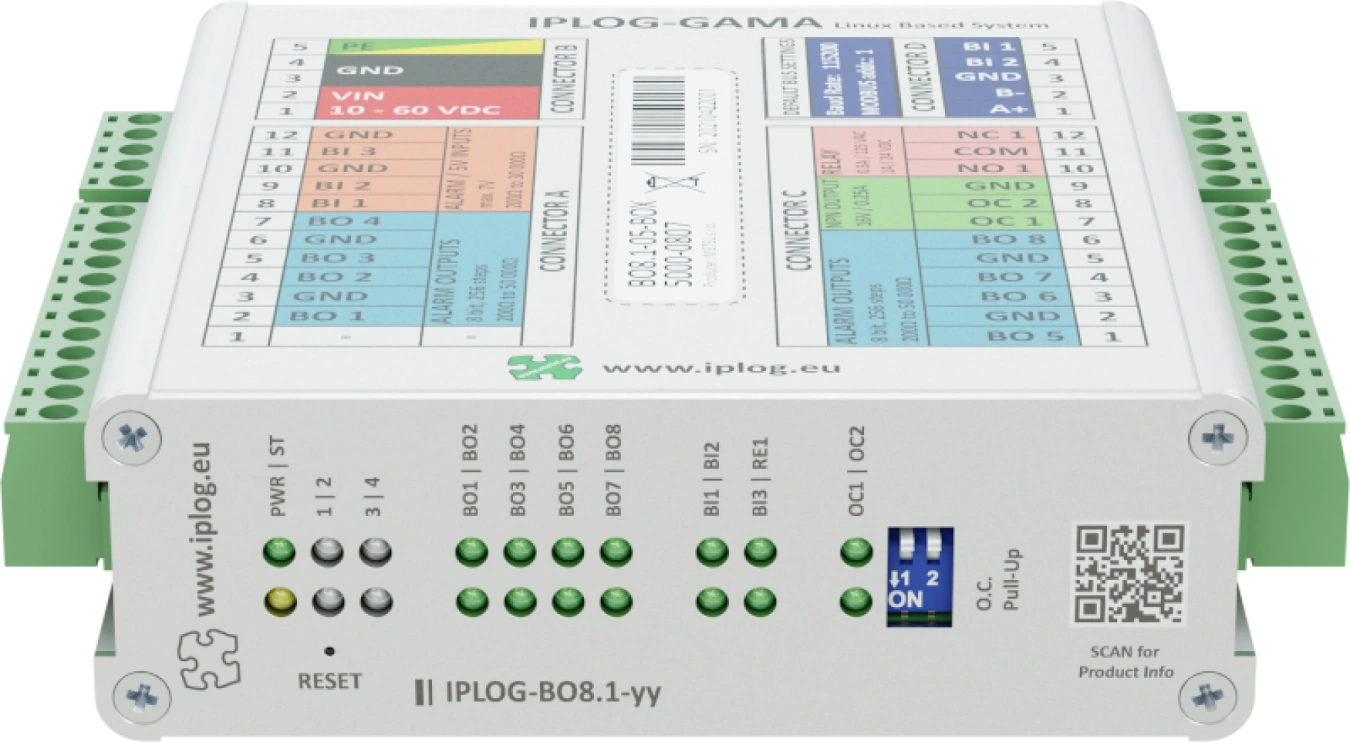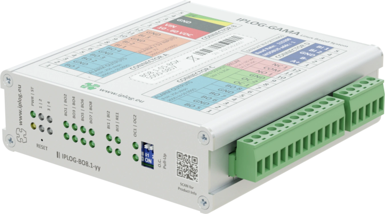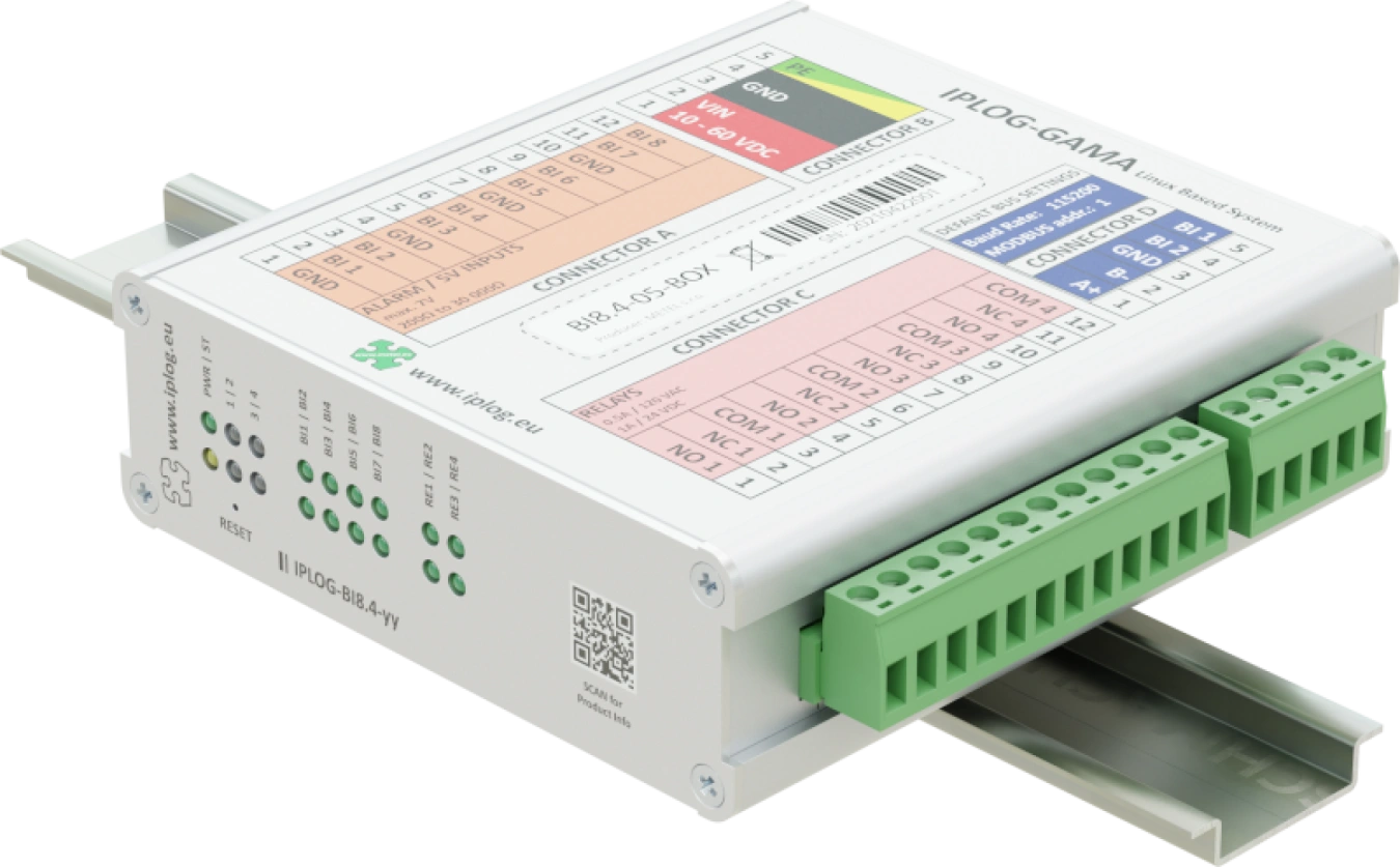 Moduły IO są urządzeniami Modbus RTU Slave i dlatego można je łatwo podłączyć do dowolnego urządzenia Modbus RTU Master. Typowymi przykładami są sterowniki PLC IPLOG-Gx i przełączniki przemysłowe LAN-RING. Wejścia i wyjścia mogą być sterowane za pomocą protokołów Modbus RTU. Przemysłowa konstrukcja ze zintegrowaną ochroną przeciwprzepięciową dla wszystkich wejść i wyjść gwarantuje niezawodne działanie nawet w bardzo wymagających warunkach. Moduły IO są przeznaczone do montażu na szynie DIN35 lub na płaskim podłożu.