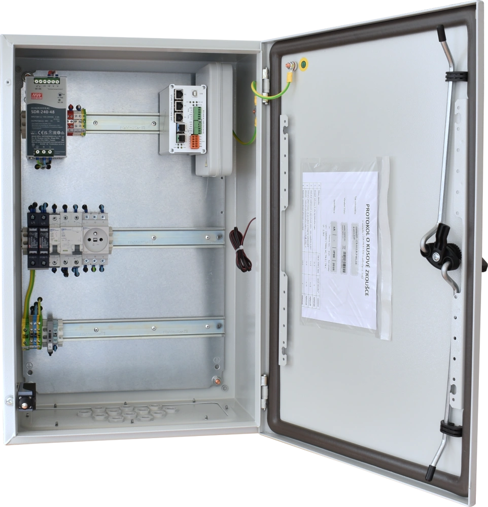 Conforme ai requisiti della norma EN 61439-1 (certificata dal TUV SUD), il quadro è ottimizzato soprattutto per le installazioni all'esterno di interruttori industriali, PLC e moduli IO METEL. Il quadro può essere equipaggiato anche con dispositivi di altri produttori. Il quadro è dotato dei seguenti componenti: Presa 230VAC tipo E (CZ), alimentatore 48VDC/120W, limitatore di sovratensione 1° + 2° stadio, interruttore automatico 4A, protettore di corrente, dimensioni: 600x400x250 mm