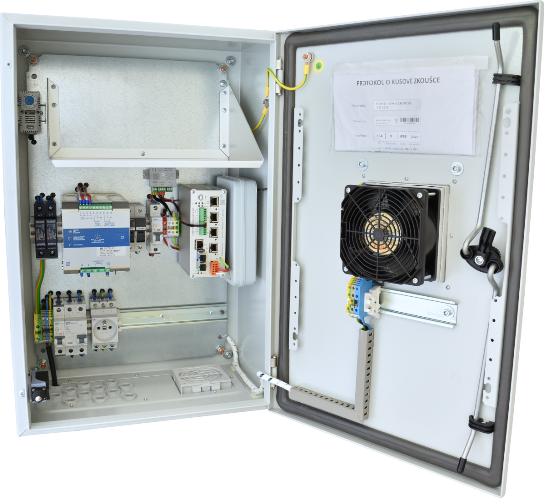 Outdoor steel switchboard with space for backup batteries. Compliant with the requirements of EN 61439-1 (certified by TUV SUD), the switchboard is optimized especially for outdoor installations of industrial switches, PLCs and METEL IO modules. The switchboard can also be equipped with devices from other manufacturers. The switchboard is equipped with the following components: 230VAC socket type E (CZ), backup power supply 48VDC/240W, surge protector 1st + 2nd stage, circuit breaker 10A, current protector, dimensions: 600x400x250 mm