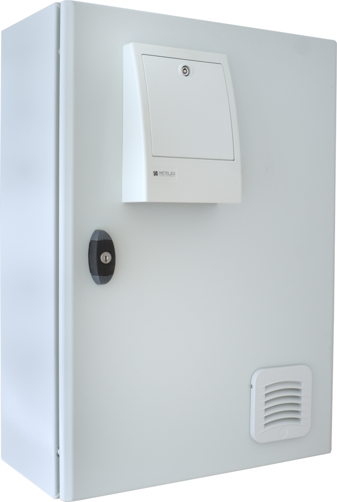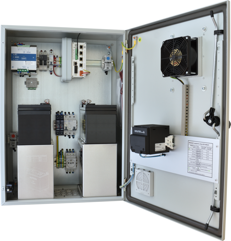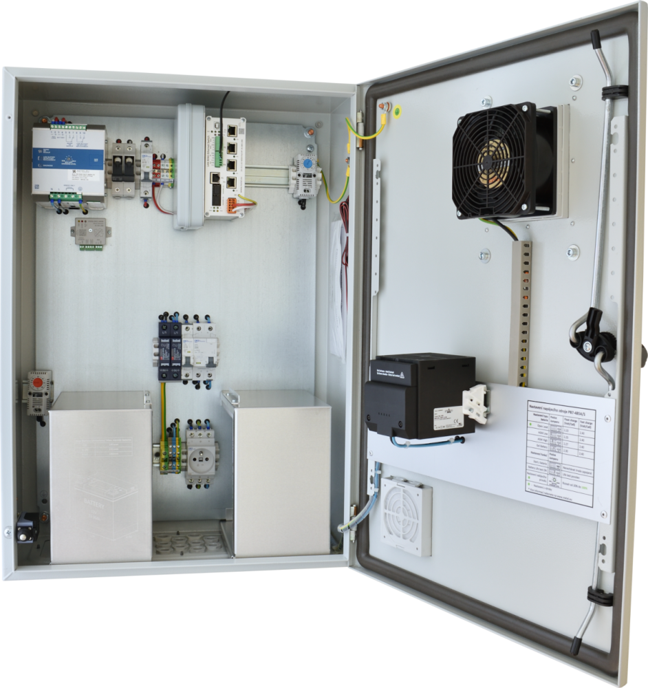 Outdoor steel switchboard with space for backup batteries. The switchboard meets the requirements of EN 61439-1 (certified by TUV SUD) and is optimized especially for outdoor installations of industrial switches, PLCs and METEL IO modules. The switchboard can also be equipped with devices from other manufacturers. The switchboard is equipped with the following components 230VAC socket type E (CZ), backup power supply 48VDC/240W, surge protector 1st + 2nd stage, circuit breaker 10A, current protector, dimensions: 700x500x250 mm