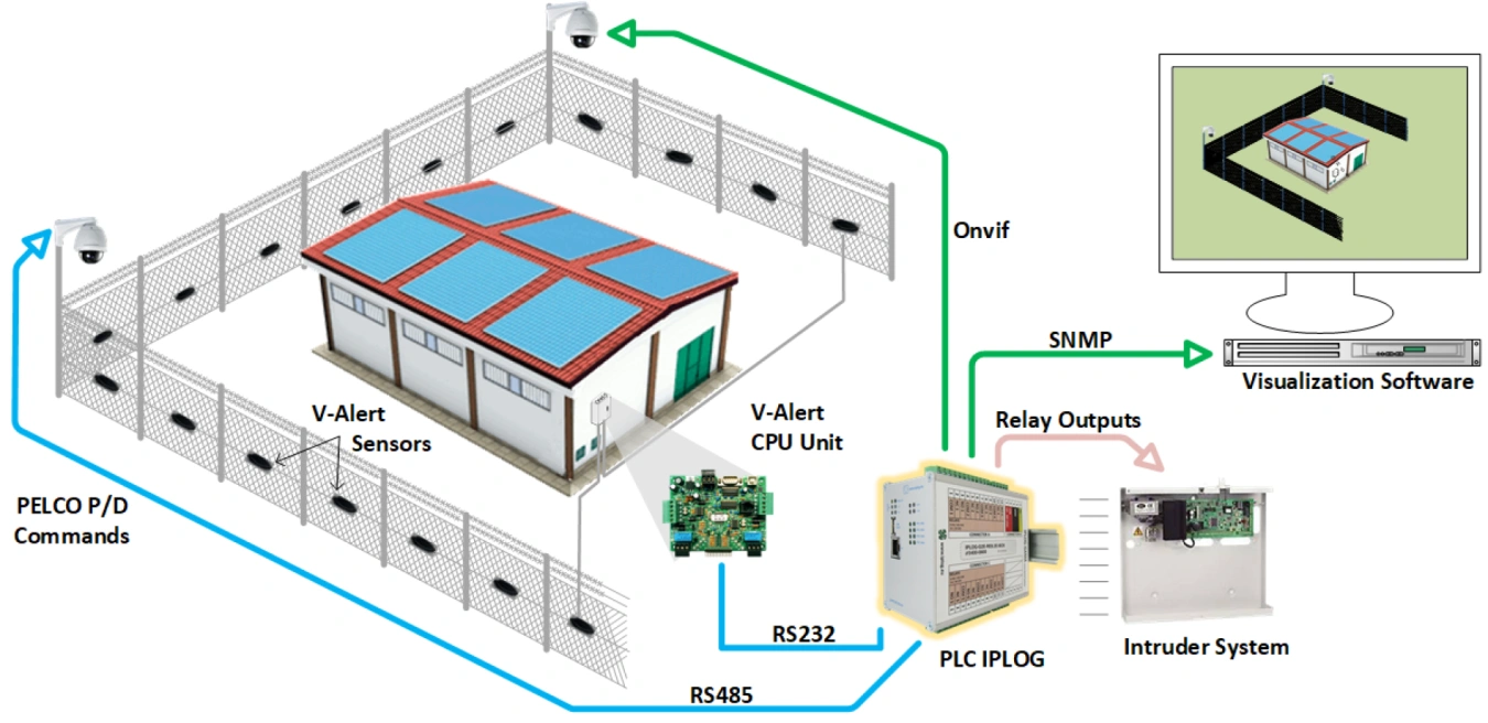 Ochrana venkovních objektů je běžnou aplikací, kde se můžete setkat se systémem IPLOG. Příkladem úspěšných aplikací jsou objekty naftových dolů na jižní Moravě. Na základě požadavku našeho dlouholetého zákazníka jsme do nástrojů dostupných v METEL IEC61131-3 IDE přidali funkční bloky přímo podporující perimetrický systém V-Alert, který komunikuje s PLC prostřednictvím sériové linky RS232. V-Alert odesílá poplachové a střihové události z jednotlivých zón, které IPLOG přijímá a na základě vytvořeného programu nastavuje/ovládá výstupy, otáčí kamery, odesílá e-maily, loguje do databáze atd.... Analogové kamery Pelco jsou ovládány prostřednictvím protokolů Pelco P/D po sběrnici RS485 a IP kamery prostřednictvím protokolu Onvif přímo po síti LAN.