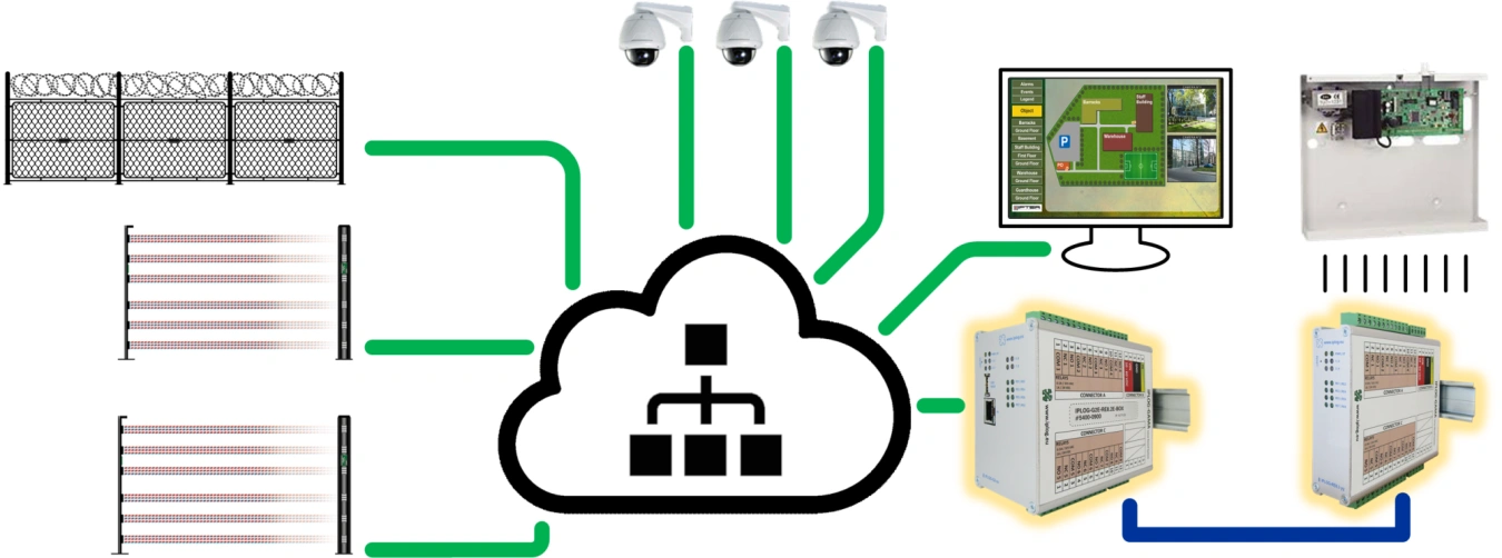 One type of application where IPLOG has proven to be an effective yet simple solution is the protection of outdoor objects. Here, IPLOGs most often provide automatic PTZ camera recording in the event of an alarm on the perimeter. For these applications we have implemented the communication protocols of the V-Alert and Absolut PRO perimeter systems, control of analog cameras via Pelco P and D and control of IP CCTV cameras via the Onvif protocol. The customer does not have to delay the implementation of individual protocols and only uses the prepared function blocks in the graphical IDE environment. This is why we can say that he can basically draw and debug the resulting program without having to master advanced programming skills.