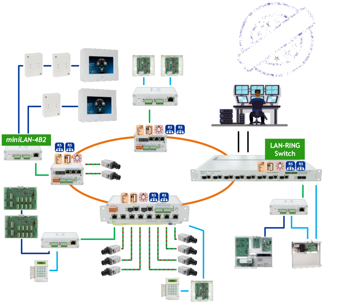 Industrial LAN-RING switches, miniLAN-4B2 converters and xDW-S-4C optical converters with RS485 ports are certified for the interconnection of security systems. In particular, the IP solution with LAN-RING switches and miniILAN converters is very innovative in its solution. Thanks to the separation of the network traffic of the different systems by VLANs and QoS and the possibility of detailed monitoring of all data connections, it can be considered a secure solution that meets the requirements of EN 50131-1 Level 3 and 4, which are verified every three years by an independent testing laboratory.