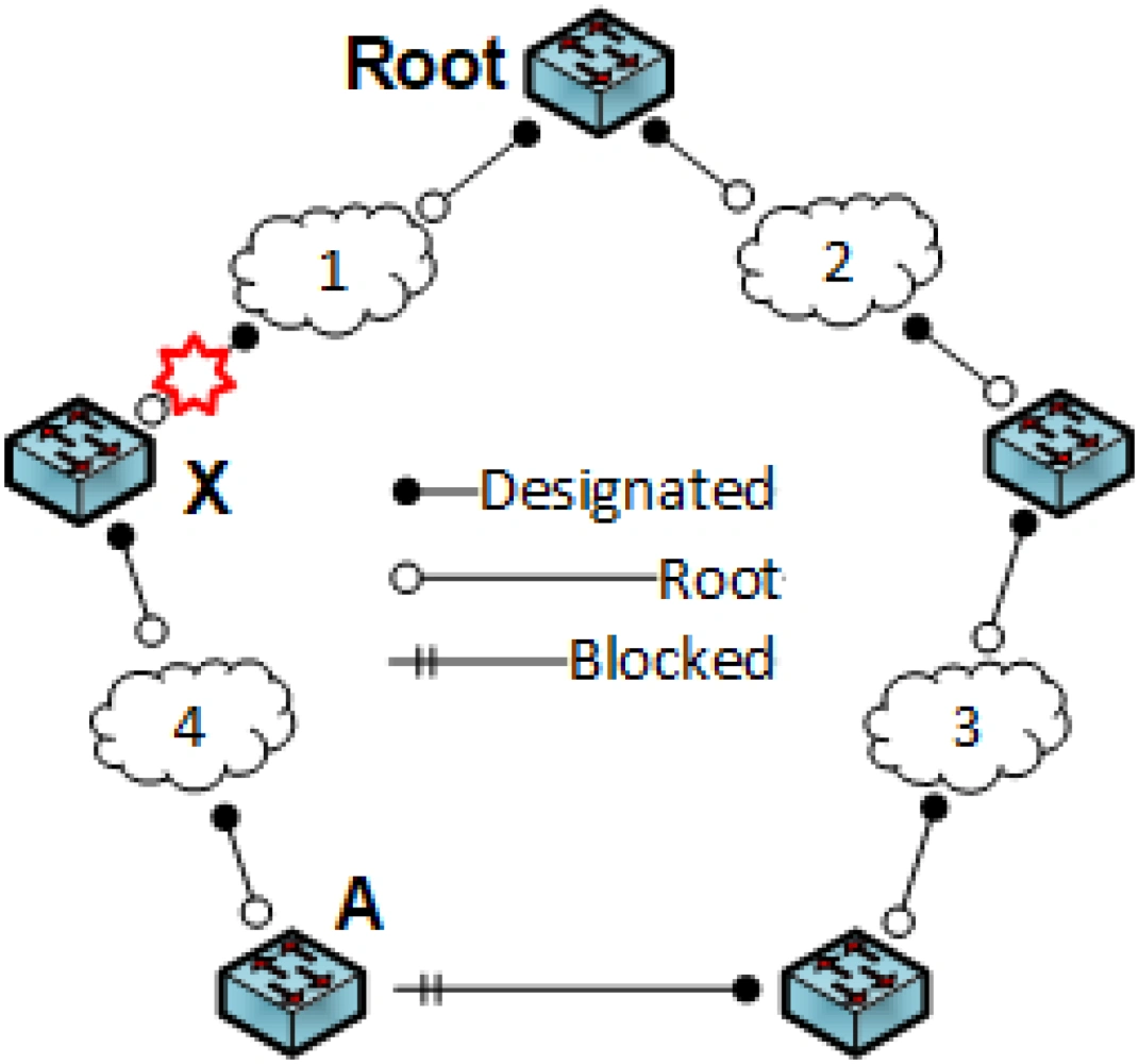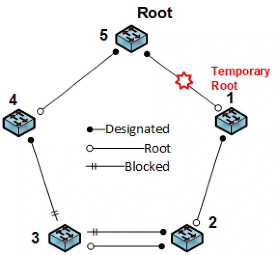 If switch 1 loses connectivity to ROOT switch (5), it declares itself (1) as the ROOT switch and propagates the information on to the active side. Switch 3, after receiving the BPDU, starts searching for an alternative path to switch 5.