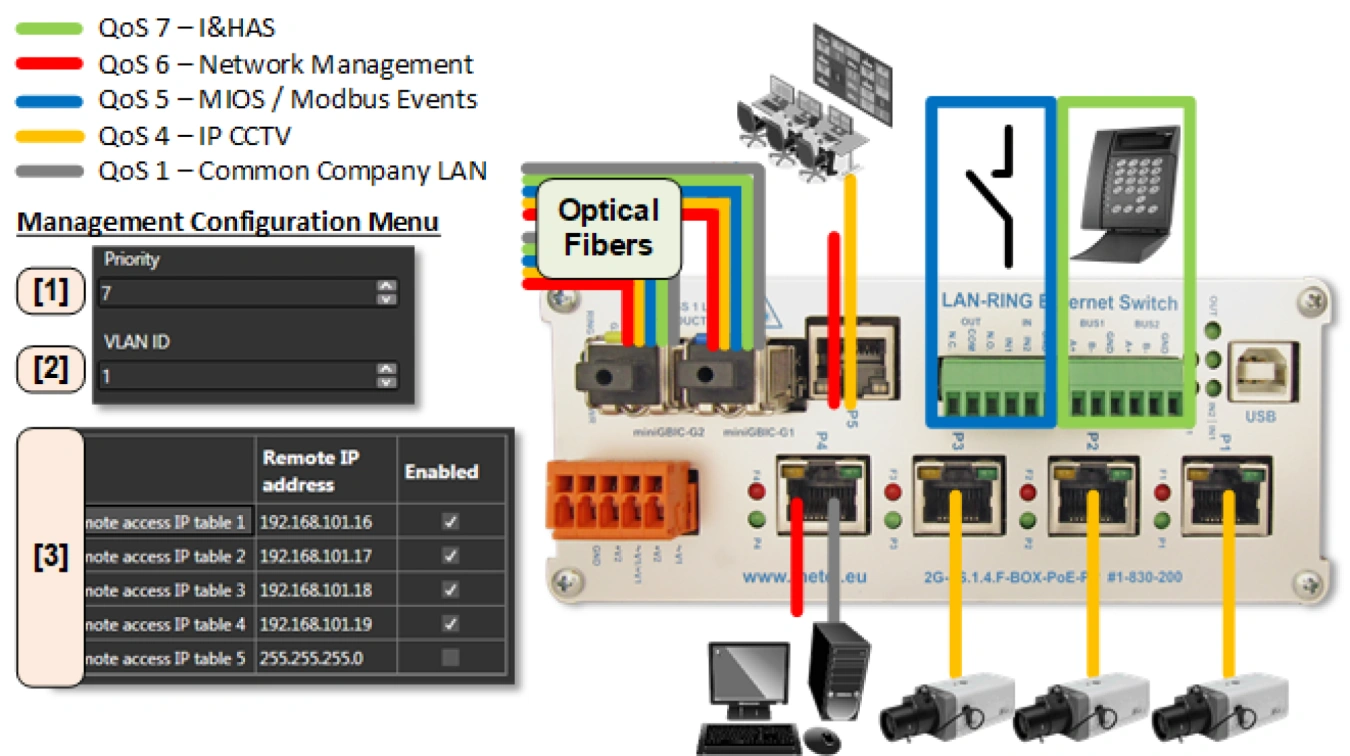 If the switches are used for the transmission of alarm system data, they are subject to EN50131-1 and different VLANs [2] and QoS [1] must be used for each service. It is recommended to assign the highest QoS to the PZTS system and the second highest to the device management.