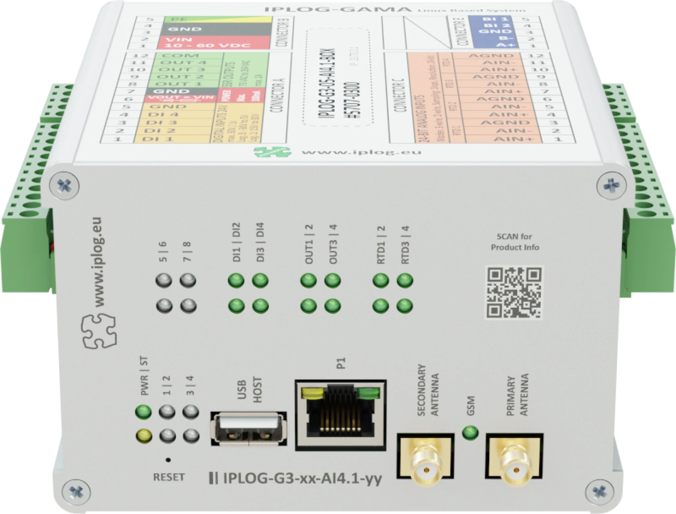 Scheda madre comprensiva di modulo CPU versione G con processore ARM CORTEX A5, sistema operativo Linux, 1x modulo LTE 2G/3G/4G, 1x ethernet 10/100 Mbps, 1x USB-A (host USB), 1x USB-B (dispositivo USB), 4x ingresso di allarme/digitale a 10 bit (5V), 8x ingressi analogici U/I a 12 bit, 2x uscite relè NOC 24 V, 2x uscite relè NO 230 V, 4x uscita open collector.