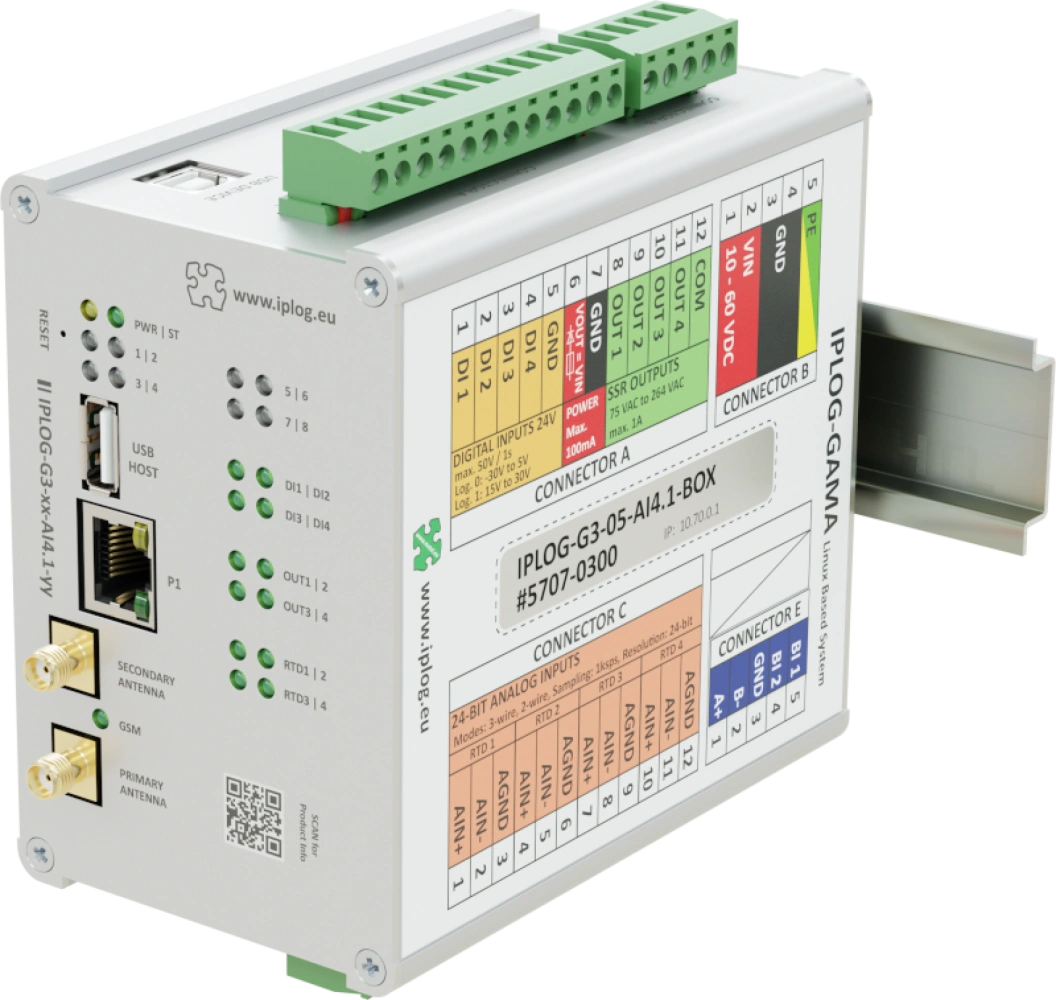 Scheda madre con modulo CPU versione G con processore ARM CORTEX A5, sistema operativo Linux, 2x Ethernet 10/100 Mbps, 1x USB-A (host USB), 1x USB-B (dispositivo USB), 2x RS485, 12x allarmi a 10 bit / ingressi digitali a 5 V, 3x ingressi digitali a 5 V, 1x uscita relè NOC a 24 V, 2x uscite NPN a collettore aperto.
