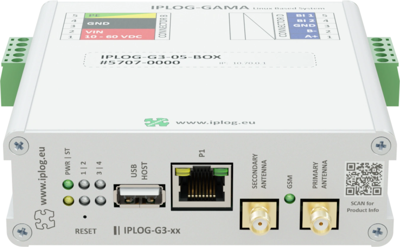 Scheda madre comprensiva di modulo CPU versione G con processore ARM CORTEX A5, sistema operativo Linux, 1x modulo LTE 2G/3G/4G, 1x ethernet 10/100 Mbps, 1x USB-A (host USB), 1x USB-B (dispositivo USB), 4x allarme 10bit/ingresso digitale (5V).