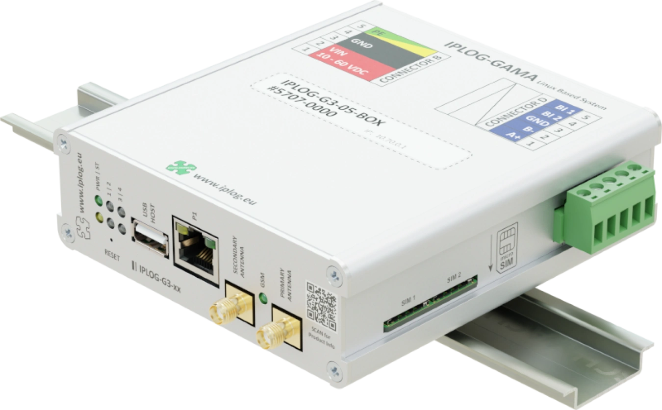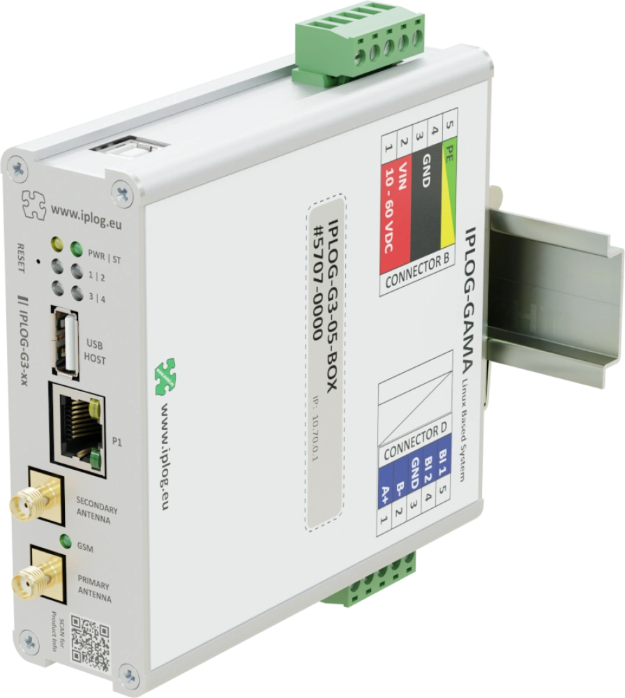 Scheda madre con modulo CPU versione G con processore ARM CORTEX A5, sistema operativo Linux, 1x modulo LTE 2G/3G/4G, 1x Ethernet 10/100 Mbps, 1x USB-A (host USB), 1x USB-B (dispositivo USB), 2x RS485, isolamento galvanico.
