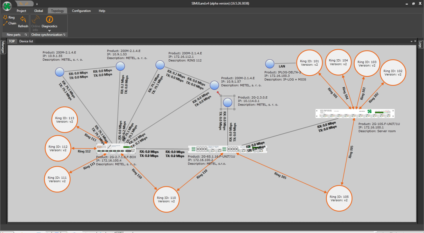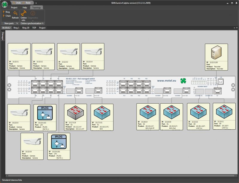 SIMULand.v4 to oprogramowanie konfiguracyjne dla wszystkich urządzeń METEL IP z automatycznym wykrywaniem i renderowaniem topologii (FW 56 i nowsze), obsługą ręcznego umieszczania topologii wszystkich starszych urządzeń METEL i kamer, serwerów, klientów. Inne narzędzia diagnostyczne: wyświetlanie statusu łączy optycznych i metalowych, wyświetlanie danych przesyłanych w Mb/s na łączach, wyświetlanie porzuconych pakietów na portach, wyświetlanie statusu PoE, wyświetlanie statusu zasilania, wyświetlanie statusu I/O/portów. Inne ważne funkcje: szybkie menu, obsługa konfiguracji USB/LAN, szyfrowana komunikacja z urządzeniami. SIMULand.v4 to darmowa aplikacja kompatybilna z systemami Windows 7, 8, 8.1, 10 i 11.