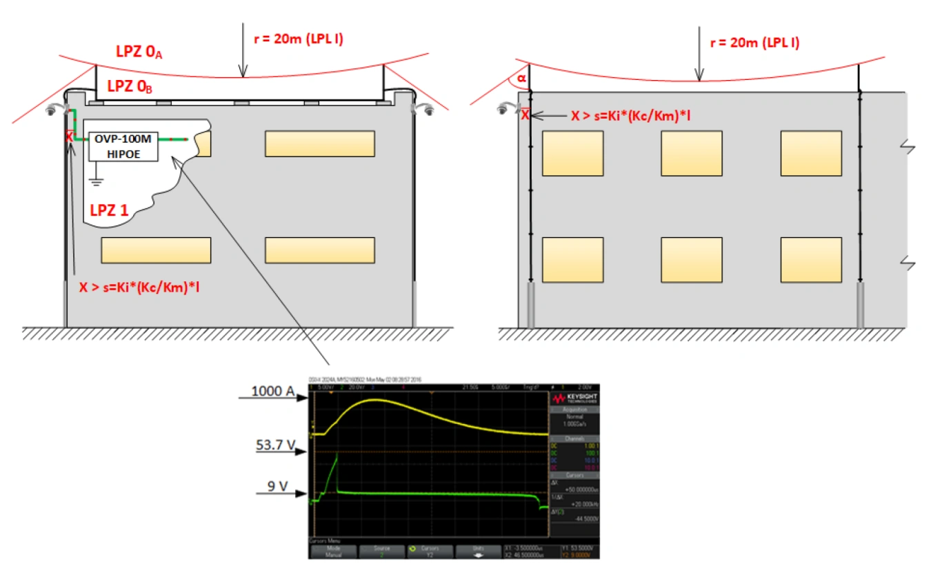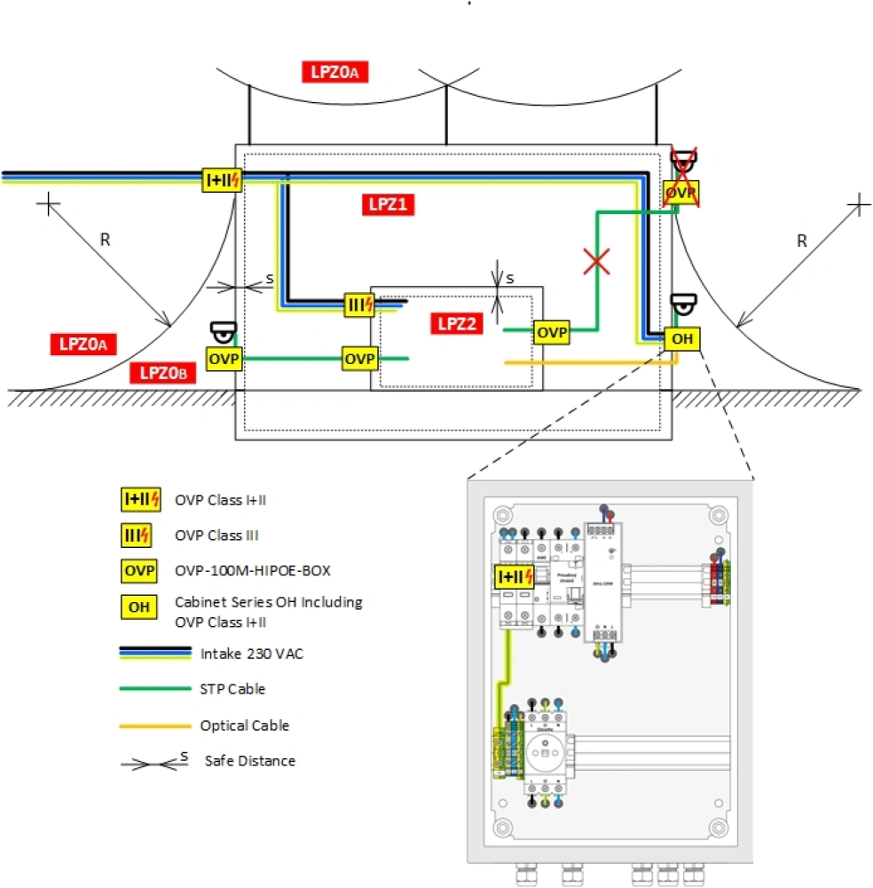 Based on the class classification of the building, it is determined how the lightning protection of the building must be sized. In particular, in applications typical of our facilities, it is necessary to ensure that the protected system is installed within LPZ 1 or higher (EN 62305-1, paragraph 8.4.2). This is achieved by installing switches, PLCs and IO modules in steel switchgear of the OH4320, OH6425, OH8625 series. The switchgear itself can be installed in zone LPZ0B.