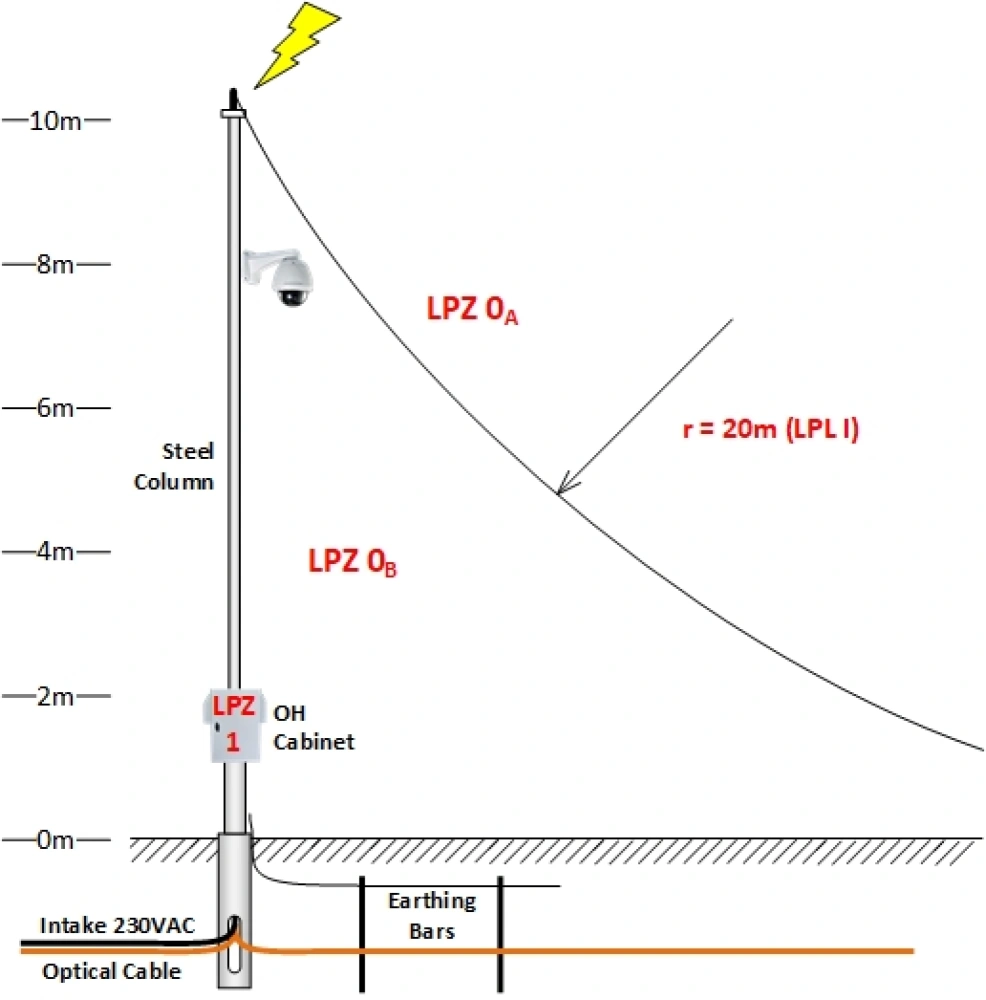 When installing on stand-alone poles, the biggest challenge is probably to meet the above mentioned requirement to install the protected system inside the LPZ 1 zone.