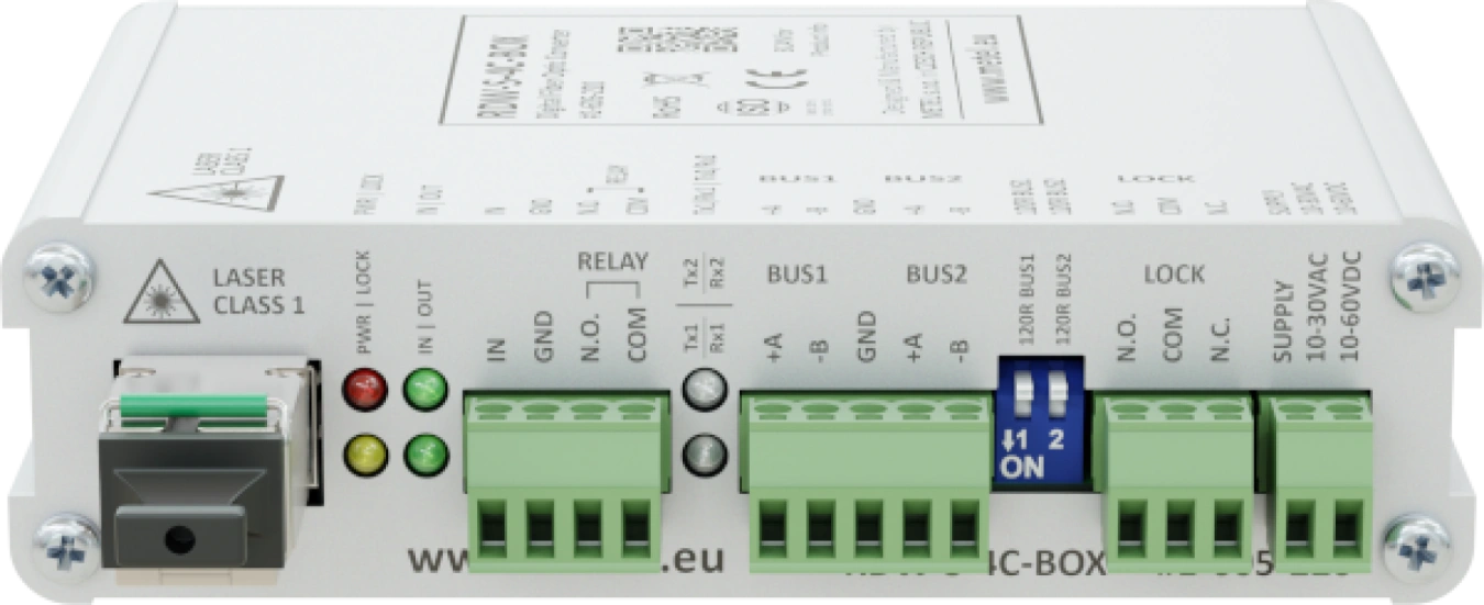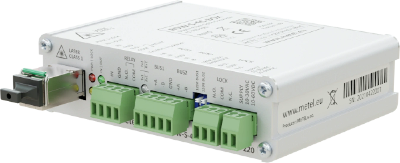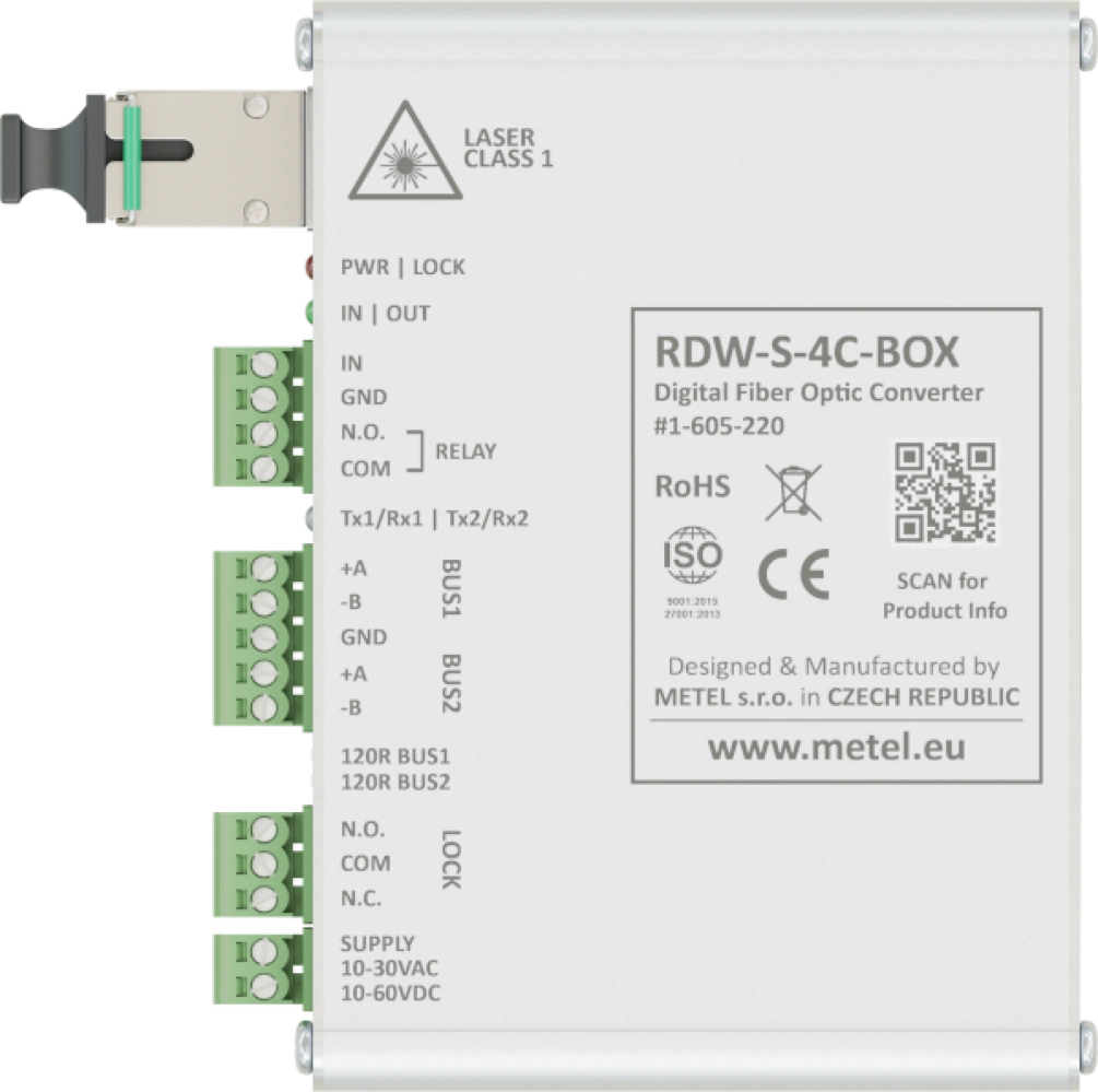 Optoaccoppiatore digitale industriale - bus 2xRS485 o 1xRS422, 1x contatto bidirezionale e 1x relè LOCK per il rilevamento dell'interruzione della fibra ottica, del guasto del dispositivo opposto e della mancanza di alimentazione