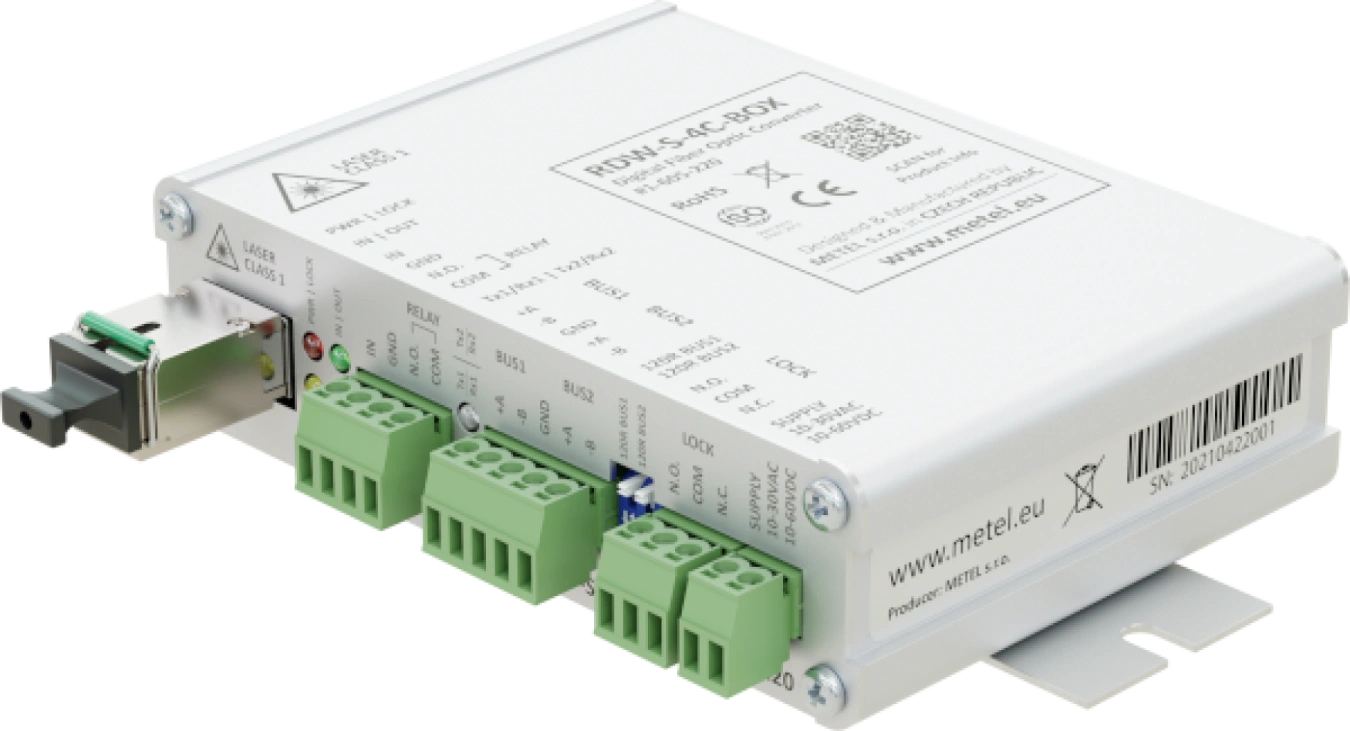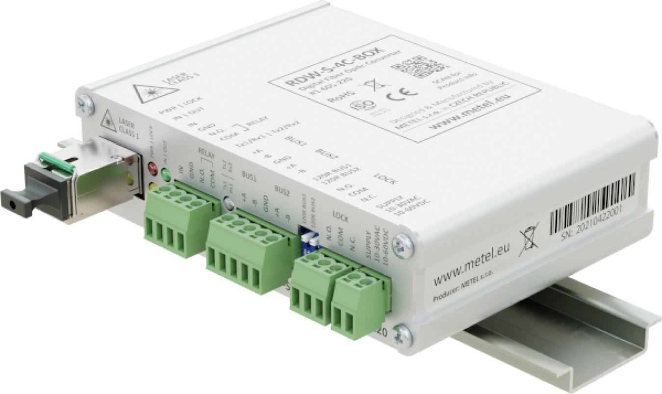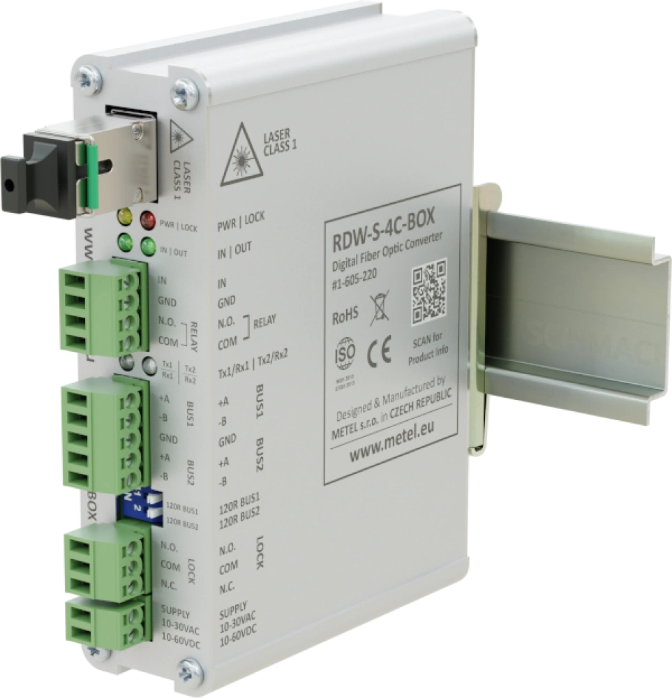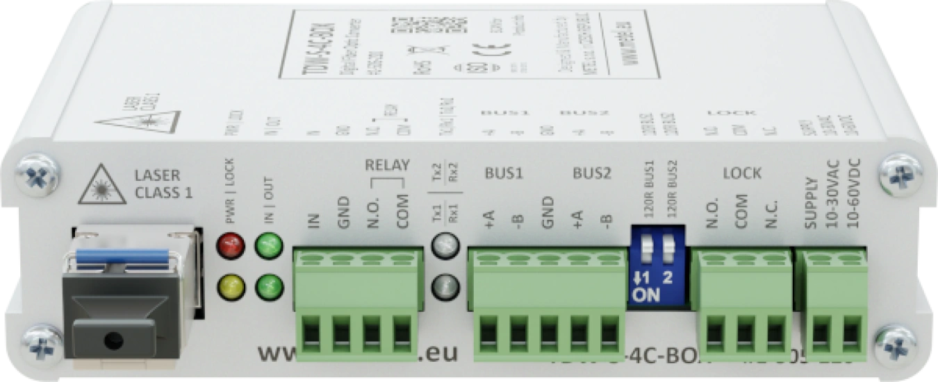 I convertitori ottici digitali xDW-S-4C sono universalmente applicabili per estendere il bus RS485/422 su fibre ottiche monomodali o multimodali. Inoltre, consentono di trasmettere un singolo contatto digitale sulla stessa fibra in entrambe le direzioni.
